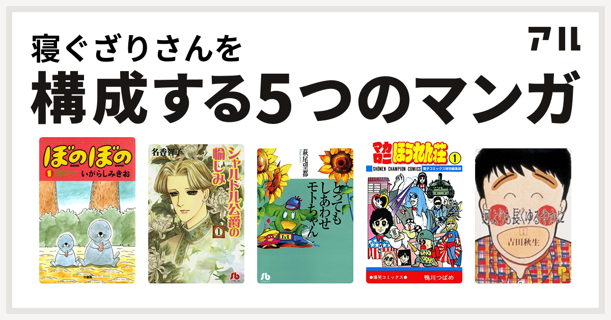 寝ぐざりさんを構成するマンガはぼのぼの シャルトル公爵の愉しみ とってもしあわせモトちゃん マカロニほうれん荘 河よりも長くゆるやかに 私を構成する5つのマンガ アル